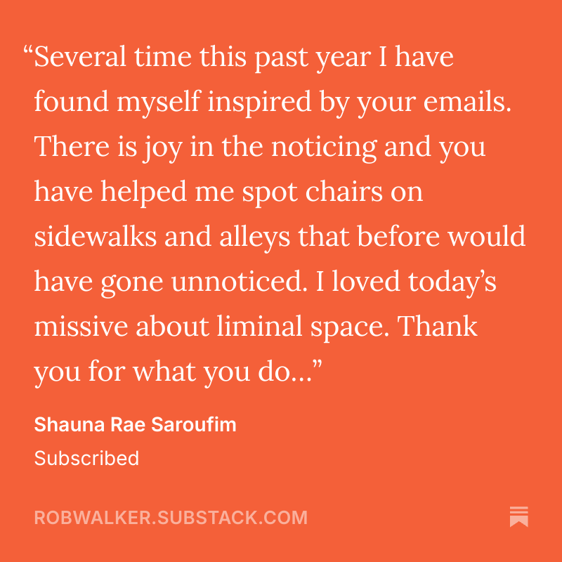 The Art of Noticing is a newsletter about creativity, work, and staying human. It’s written by me, journalist and author Rob Walker. I share useful ideas, practical prompts, and unexpected inspiration that will help you pay attention to what you care about, and care about what you pay attention to. It’s for people who want to stay interested in life.