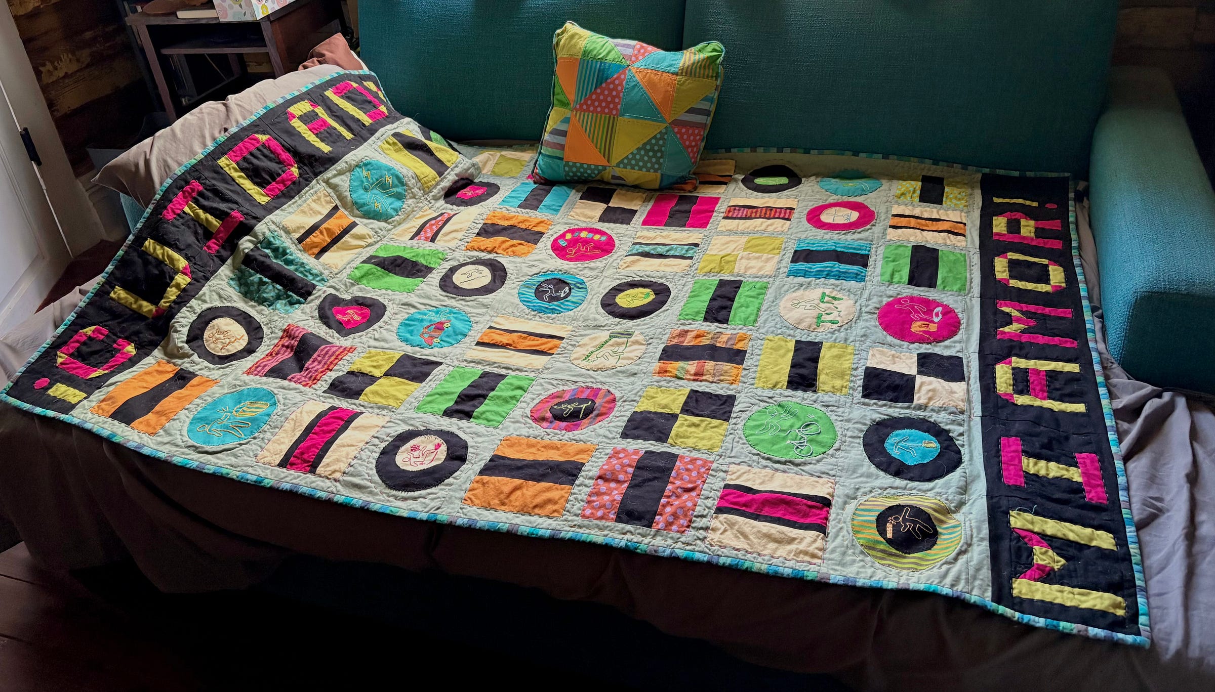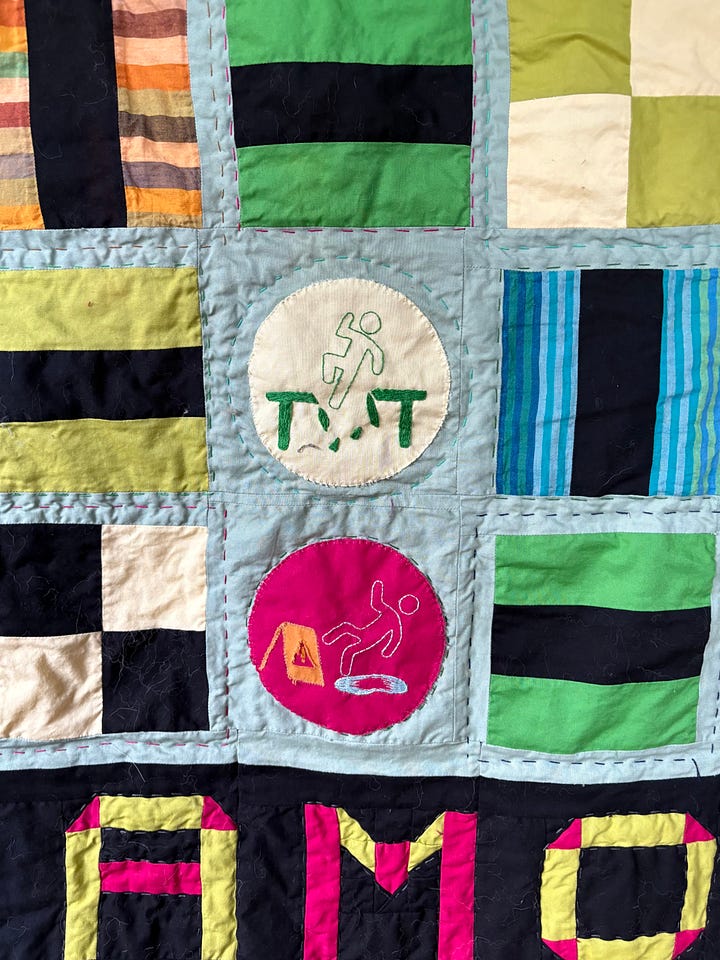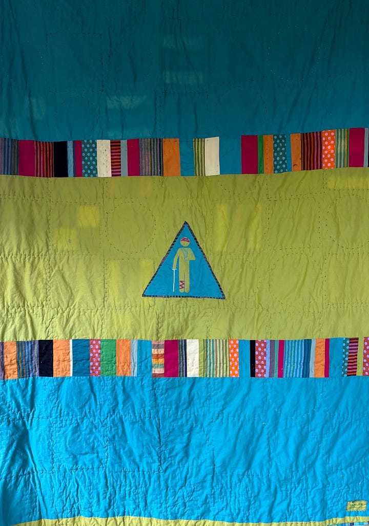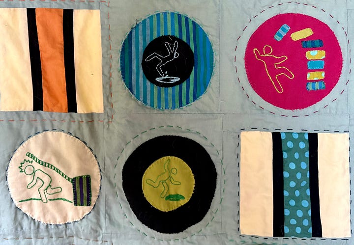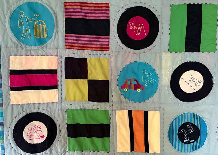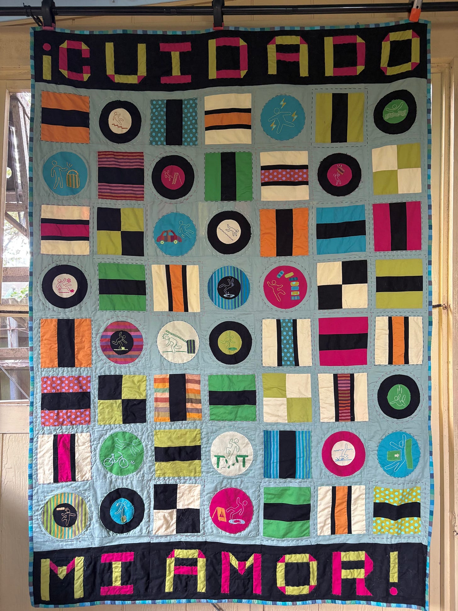 This “allsorts” pattern was in turn inspired by liquorice confectionery assortments that mix circular and striped-block candies in bright, contrasting colors. E customized the pattern and had her own take on the colors, but of course the most striking element is the army of Cuidado Folk being warned to take care, or suffering the consequences of incautious behavior: zapped by electricity, falling down stairs, getting clobbered by gates, tumbling off ladders. She searched extensively online to find figures in poses well beyond wet floors, and these are hand-embroidered onto the quilt blocks. In the end she titled the work, Cuidado Man in All Sorts of Peril.1
