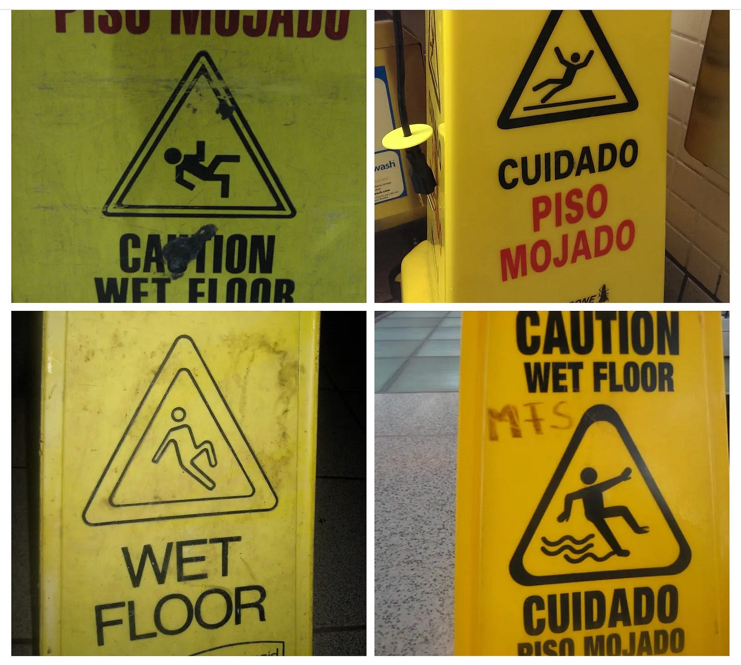 I got interested in the different poses of the figures used on “wet floor” signs — or “Cuidado Man,” as I’ve long called him. Sometimes he looks like he’s moshing, or surfing. I have a lot of these. I think maybe I originally thought I’d research and analyze the various designs and write something some day? I doubt I’ll get around to that. But I still look out for new variations. Trust me, Cuidado Man is everywhere.