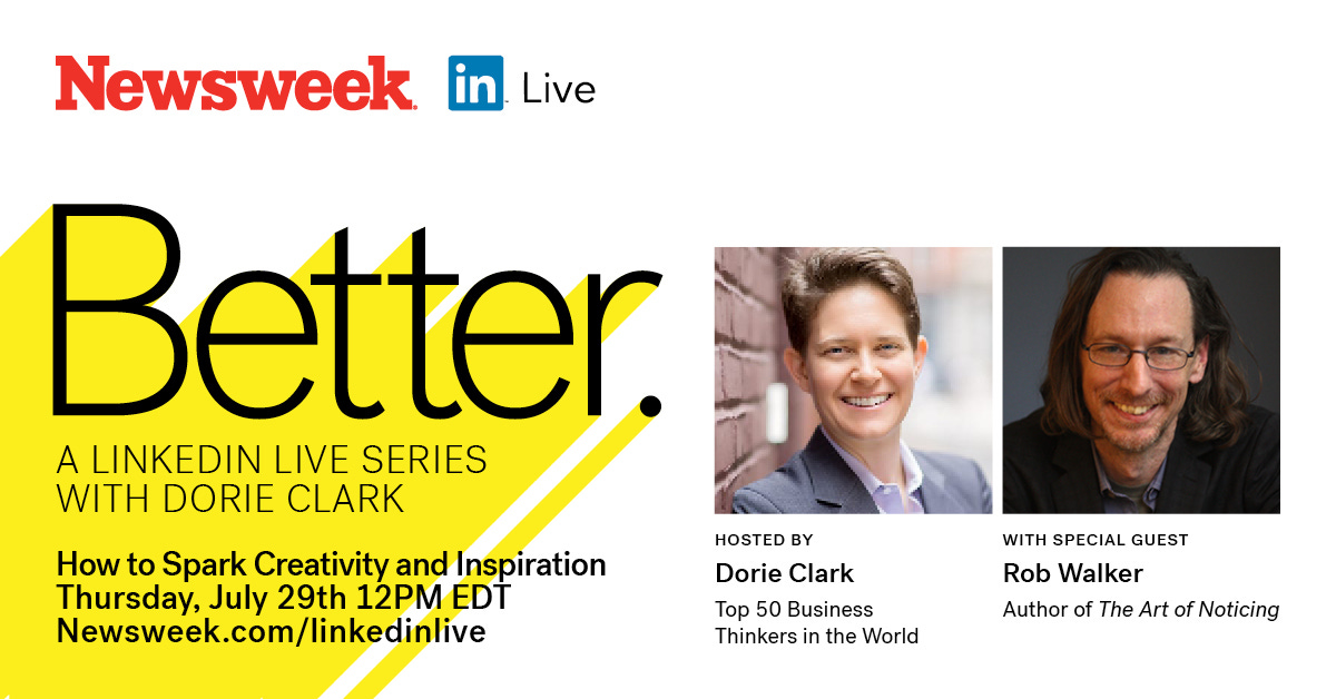 I could not be more thrilled to be in conversation with the wonderful Dorie Clark this Thursday at noon Eastern, as part of Clark’s highly popular Newsweek/LinkedIn Live series, Better. We’ll be talking about how to spark creativity & innovation — and about noticing, of course. Put it on your calendar here.
