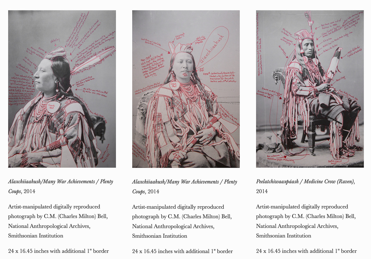 The series consists of photographs originally taken by a Washington, D.C., studio photographer of a delegation of Crow chiefs and leaders that Red Star has digitally manipulated and annotated — and in the process, recontextualized. To quote from the site of the Birmingham Museum of Art: