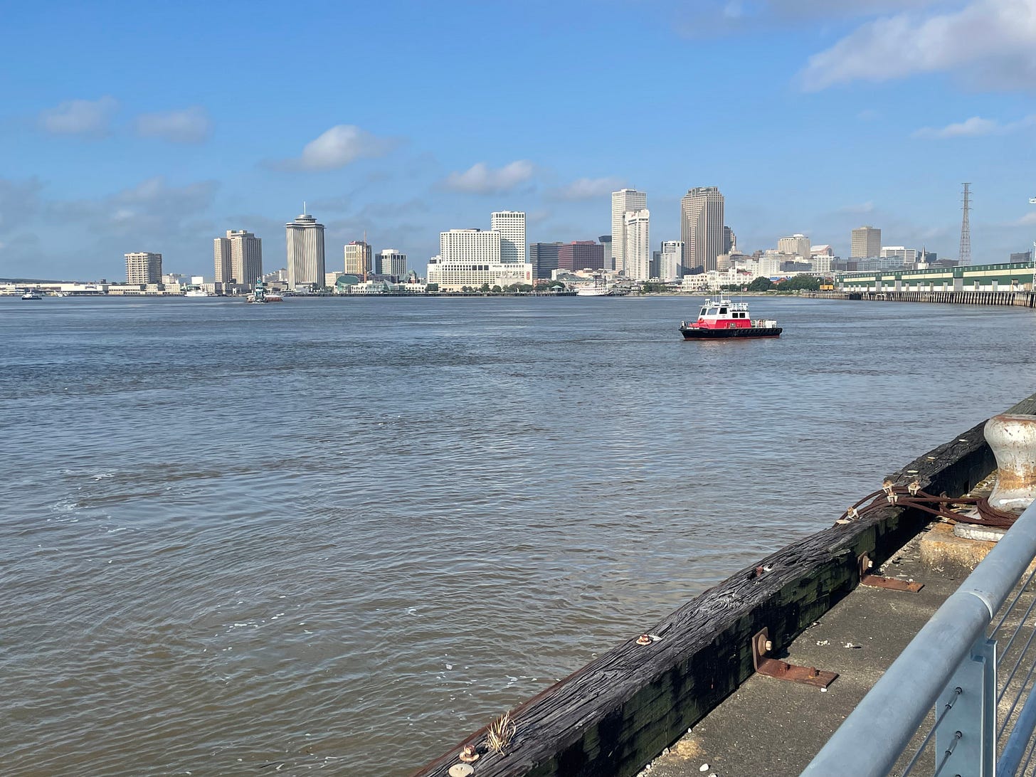 I’m really interested in those discoveries. For me, there’s a spot in Crescent Park here in New Orleans where I always stop when a bike ride takes me along that route: a former wharf that was definitely engineered for commerce rather than calmness, but is now most striking for its peaceful view of the Mississippi. “We can learn how to locate calm in a place not designed for calm,” Ritli writes.