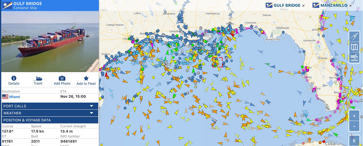 When I encountered the Gulf Bridge IRL, chugging along the Mississippi, it was bound for Miami. In the screen shot above, it’s out in the Gulf, where that red box right in the center indicates. On the actual site you can zoom in on the map for a clearer look, but I screenshot the wide version because … look at all all the other vessels! Much that you take for granted — the food you eat, your everyday household objects — almost certainly depends in part on this astonishing web. It is a classic example of something vital that nobody particularly wants you to notice.